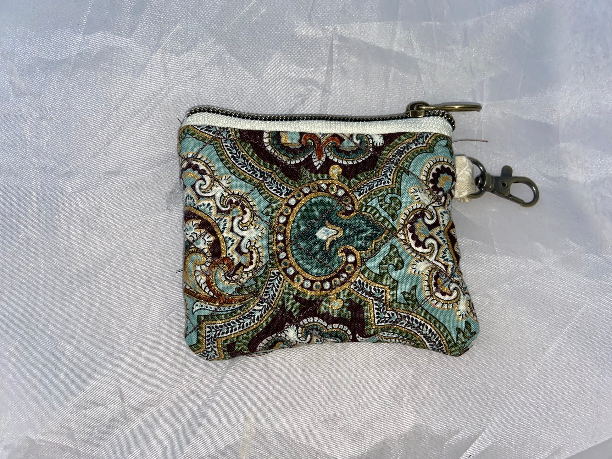Hand crafted blue wallet equipped with sturdy zipper and hook clasp.